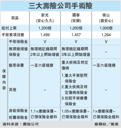 南山人壽去年10月推「真安心手術險」,國泰人壽在3月推出「安順手術險」,新光人壽則在本周推出「安心久久手術險」,業者為提高競爭力,不斷進化商品設計,例如:南山人壽的真安心推出之際,強打手術理賠項目達1,264種,是南山人壽主力商品之一。